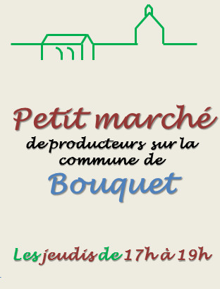 Avis ! Démarrage bientôt du petit marché de producteurs sur BouquetAvis ! Bientôt un petit marché de producteurs sur la commune de Bouquet, toutes les semaines Les jeudis de 17h à 19h, au Temple du Puech. Démarrage jeudi 18 juin 2015. Qu’on se le dise ! - 05/2015 Categories: Annonces
