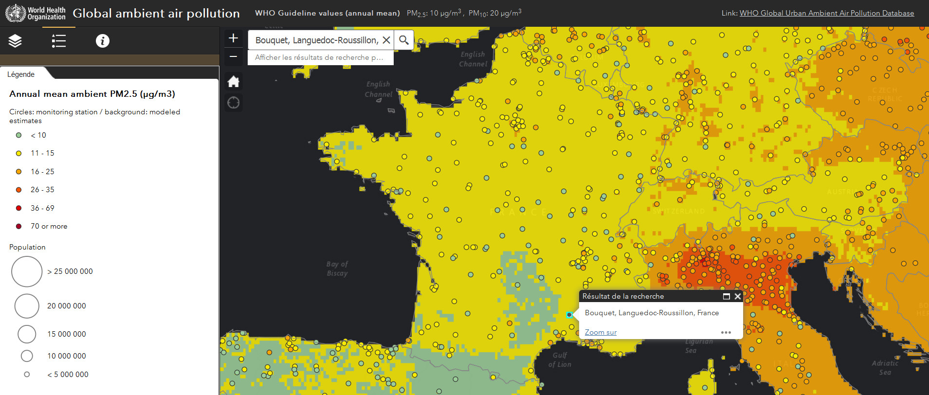 L’OMS vient de publier une carte interactive mondiale de la pollution de l’air en particules fines. Bien que l’on ait l’impression à Bouquet que nous sommes loin de toute pollution et que l’air y est plus pur qu’ailleurs … eh bien, ce n’est qu’une impression : nous faisons bien partie des 92 % de terriens qui respirent un air trop pollué. Edifiant !