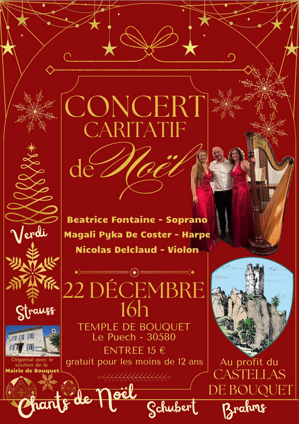 « Le dimanche 22 décembre à 16h aura lieu au Temple de Bouquet un concert de Noël d’exception dont les bénéfices seront reversés à l’association qui œuvre pour la sauvegarde du Castellas de Bouquet.Les solistes de stature internationale sont : Nicolas Delclaud, originaire du Village de Bouquet, il a commencé le violon à l’âge de trois ans. 1er prix à l’unanimité du jury du conservatoire national supérieur de musique de Paris et Lauréat de concours internationaux, il représente la France au concours Eurovision des jeunes solistes. Nicolas Delclaud est premier chef d’attaque et premier soliste à l’orchestre Philharmonique de Monte-Carlo. Il donne des concerts Au Japon, en Chine, aux États-Unis, en Europe… Il est le créateur et directeur musical du Festival de musique « Bouquet de Musique » depuis 2013. Magali Pyka de Coster est une harpiste internationale renommée. Elle est professeur de harpe au conservatoire de Antibes et se produit très régulièrement avec les orchestres de Nice, Cannes et Monte-Carlo et occupe le poste de Harpiste Solo de l’orchestre Philharmonique Azuréen. Béatrice Fontaine soprano lyrique internationale renommée est également pianiste, prix de chant des conservatoires de la ville de Paris. Chef de Chœur à la maîtrise de Notre Dame de Paris et aux conservatoires d’Antibes, Juan les Pins et Grasse. Elle est officier de la réserve citoyenne de l’armée de l’air et de l’espace.