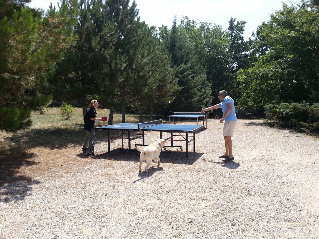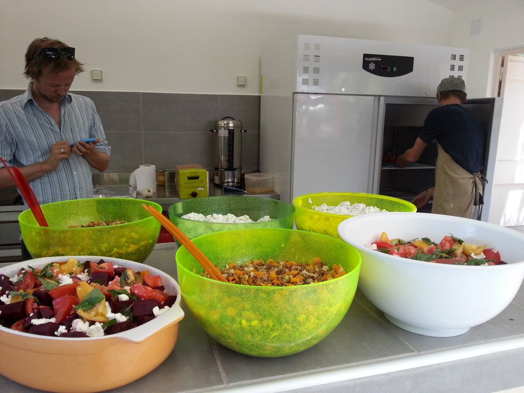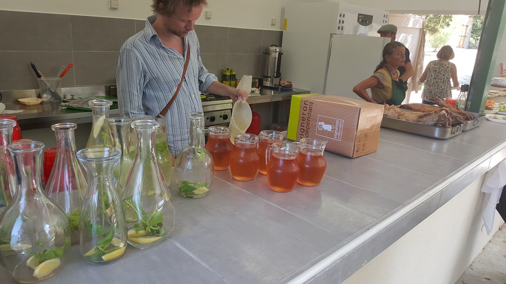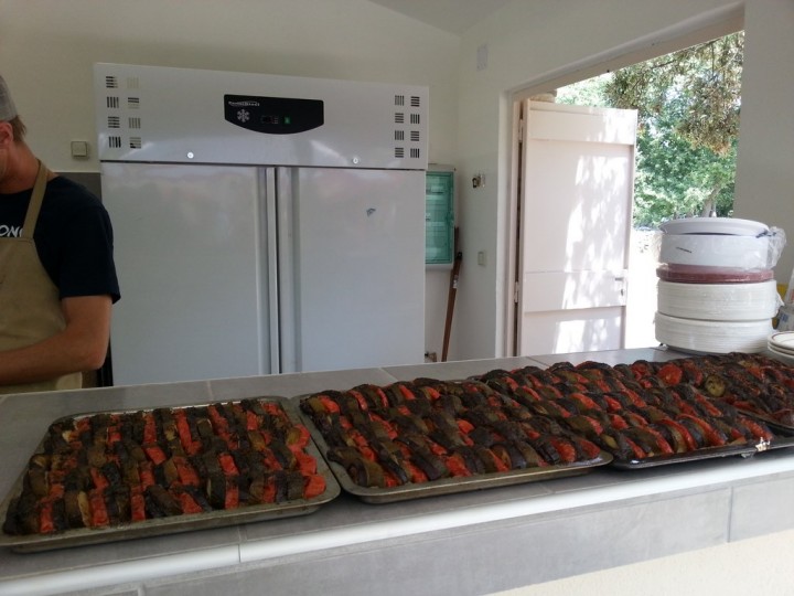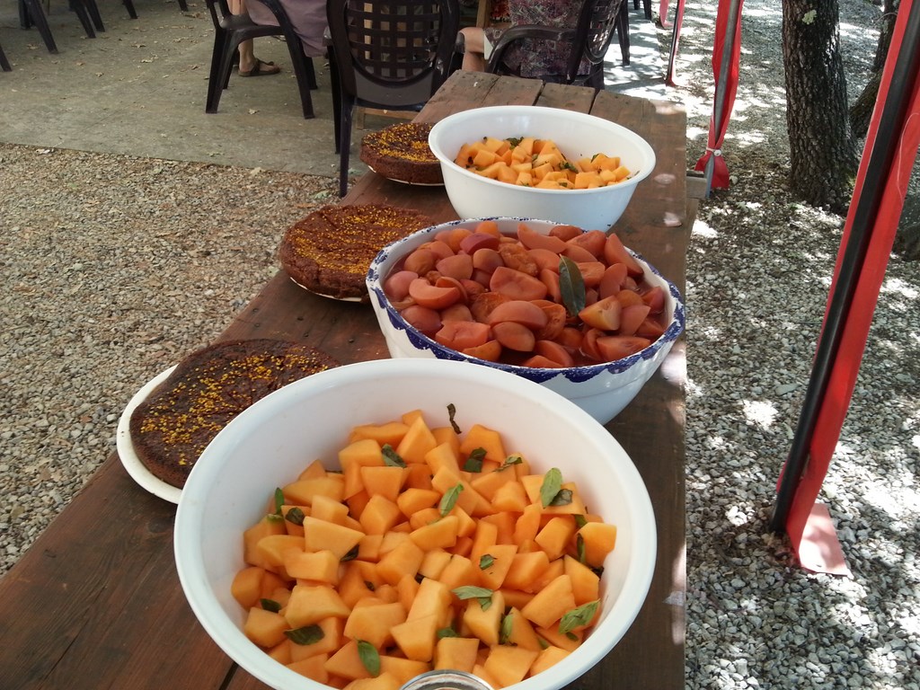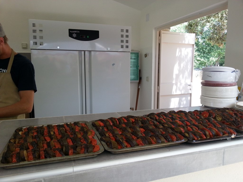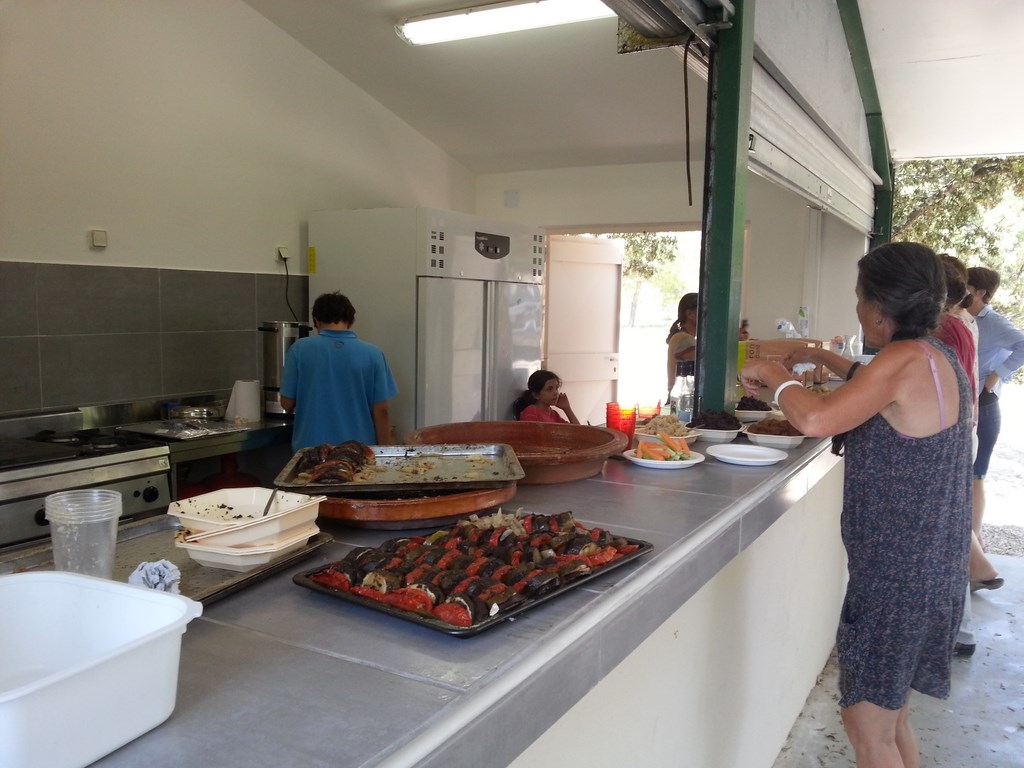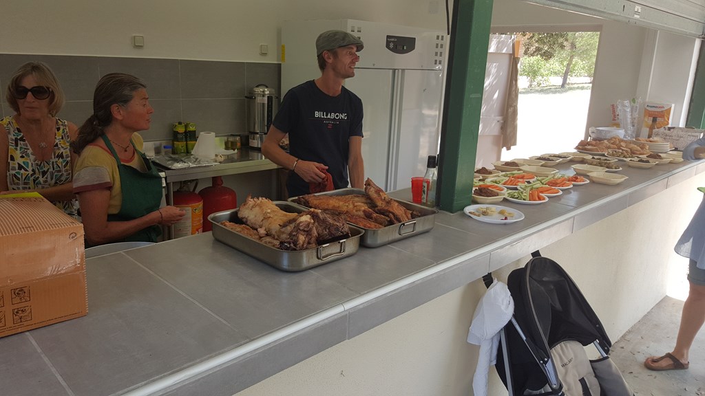 Le repas était savoureux : deux jambons de porcs Duroc élevés sur Bouquet par Julien Mason et très bien rôtis par Marteen, notre chef cuisinier d’un jour ; des salades inventives et fraîches, tapenades, caviars de légumes et autres tians ; des desserts de fruits macérés aux herbes fines, gâteaux aux amandes récoltées sur Bouquet au pollen de Serge Perlès … Tout était vraiment bon, – et avait été acheté le jeudi d’avant au Petit Marché de Bouquet !