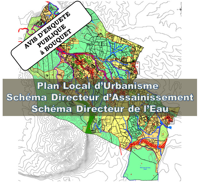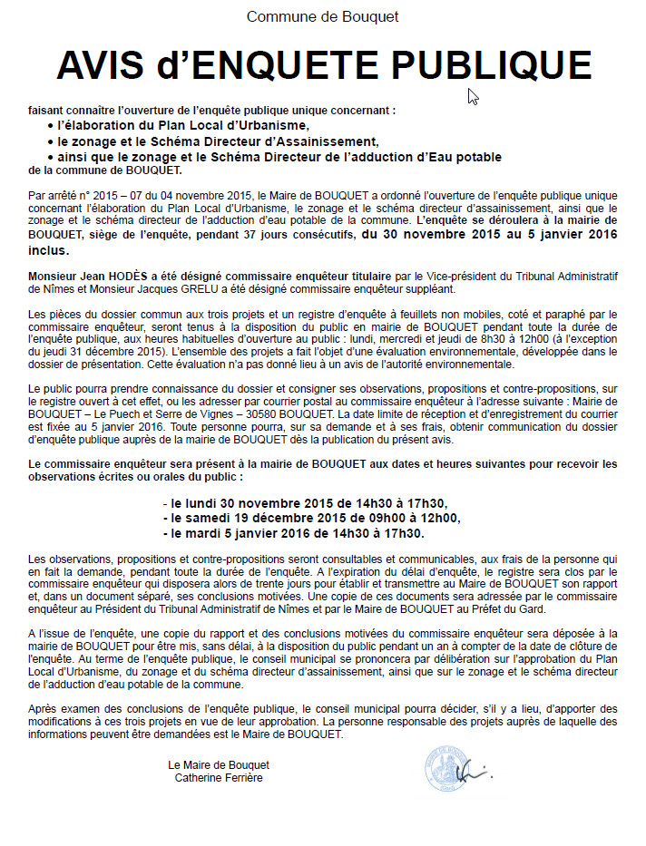2015-09-14_141615Par arrêté n° 2015 – 07 du 04 novembre 2015,  le Maire de BOUQUET a ordonné l’ouverture de l’enquête publique unique de la commune de BOUQUET, concernant l’élaboration du Plan Local d’Urbanisme, le zonage et le Schéma Directeur d’Assainissement, ainsi que le zonage et le Schéma Directeur de l’adduction d’Eau potable. L’enquête se déroulera à la mairie de BOUQUET, siège de l’enquête, pendant 37 jours consécutifs, du 30 novembre 2015 au 5 janvier 2016 inclus.