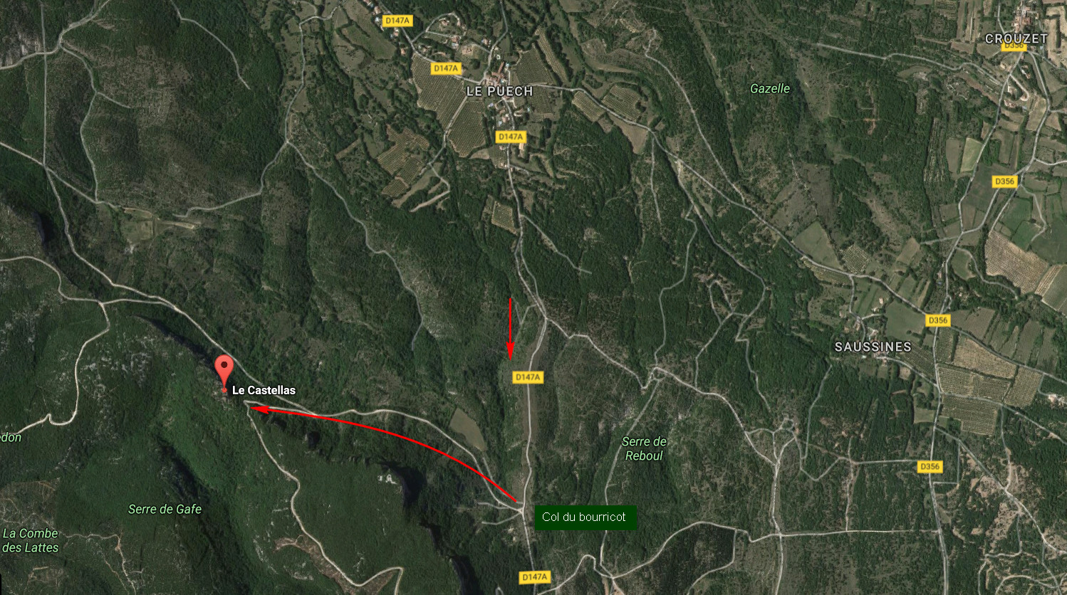 Monter du hameau du Puech vers le Mont Bouquet par la route du Castellas (D 147a), et au Col du bourricot, emprunter le chemin de terre qui part à droite. C’est au bout.