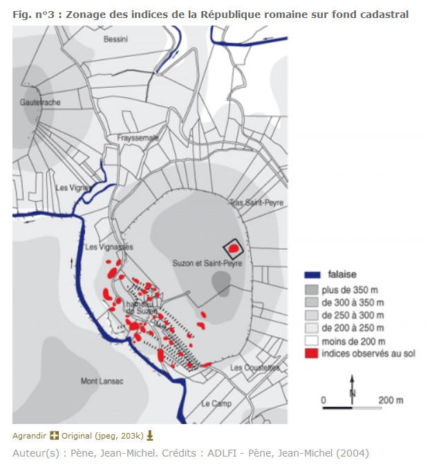 14 À la fin du XIIIe s. et au début du XIVe s., des éléments (céramiques et architecturaux) indiquent une réoccupation du haut de la colline de Saint-Peyre, avec peut-être l’implantation d’un bâtiment (chapelle ?). À cette même époque, il semblerait qu’un habitat, en partie masqué par le hameau de Suzon, se développe au bas du relief. Enfin, pour les périodes contemporaine et moderne le hameau de Suzon est implanté définitivement sur le flanc sud-ouest de la colline de Saint-Peyre [(Provost, Michel. 1999.) ; (Pène, Jean-Michel. 2002.)]. «