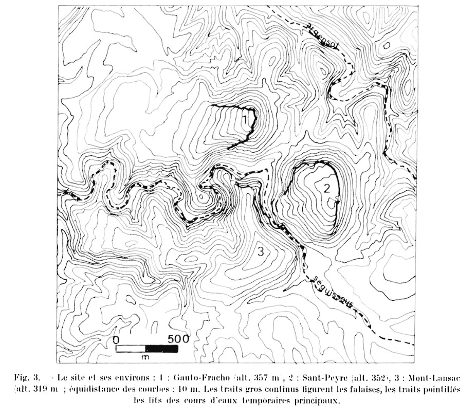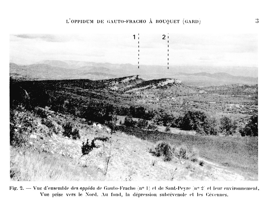 « « Refuge des Volques arécomiques » ou camp « néolithique », le ranc de Gauto-Fracho, par son rempart de pierres sèches et les nombreuses grottes qui s’ouvrent dans ses falaises, n’a pas manqué d’attirer l’attention des protohistoriens nimois qui prospectèrent dans ces parages au cours de la première moitié du XXe s.
