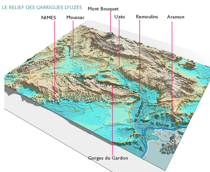 A une échelle plus précise, chaque unité de paysage est presque toujours délimitée par un relief particulier. Ainsi par exemple les nombreuses unités du monde des Garrigues s’organisent en plateaux et plaines, séparés par des coteaux francs et nets parfaitement perceptibles dans le paysage.