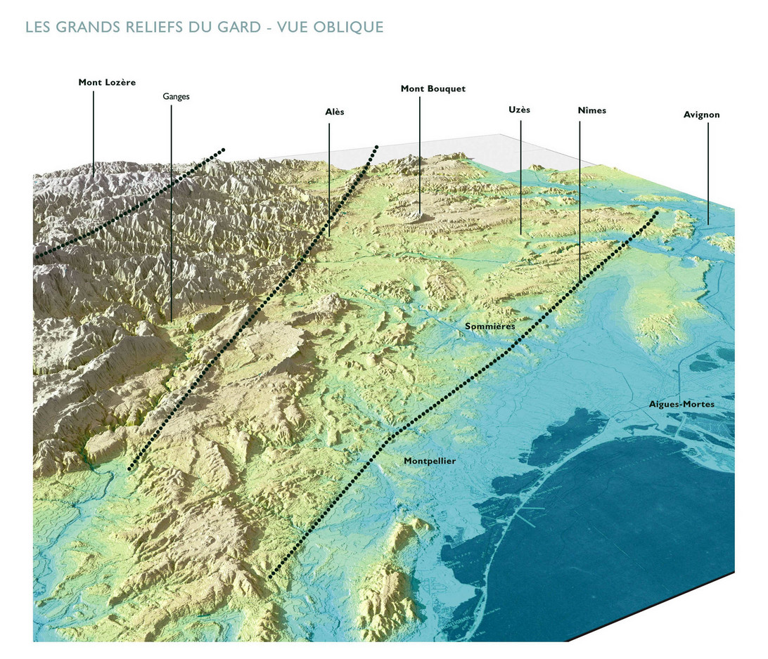 L’organisation des paysages du Gard se comprend fondamentalement et essentiellement par l’observation de ses reliefs. Ceux-ci sont précisément définis, et même contrastés les uns par rapport aux autres, au point qu’ils dessinent presque partout à eux seuls les limites des grands ensembles et des unités de paysage du département.