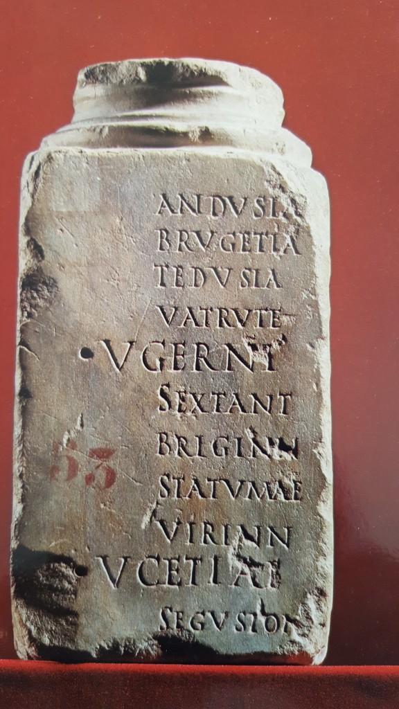L’étymologie de Suzon ne pose pas de problème car elle est attestée par cette inscription « Segusto », sur cette poterie que l’on trouve au Musée lapidaire de Nîmes. Segusio ou Segusto est le chef lieu de la peuplade des Segusiones ou Segustones, car les Romains créèrent des divisions administratives (civitates) en leur attribuant le nom que se donnaient ces peuplades antérieures à leur colonisation. L’oppidum de San Peile, les vestiges archéologiques du village de Suzon viennent de plus attester l’antiquité du peuplement en un lieu particulièrement remarquable. On peut considérer Suzon comme la cité originelle de l’actuelle commune de Bouquet. Et maintenant que nous avons Segustones, chacun remarquera la parenté de ce nom avec le nom de la rivière Segusson ou Seguisson, avec la même racine.
