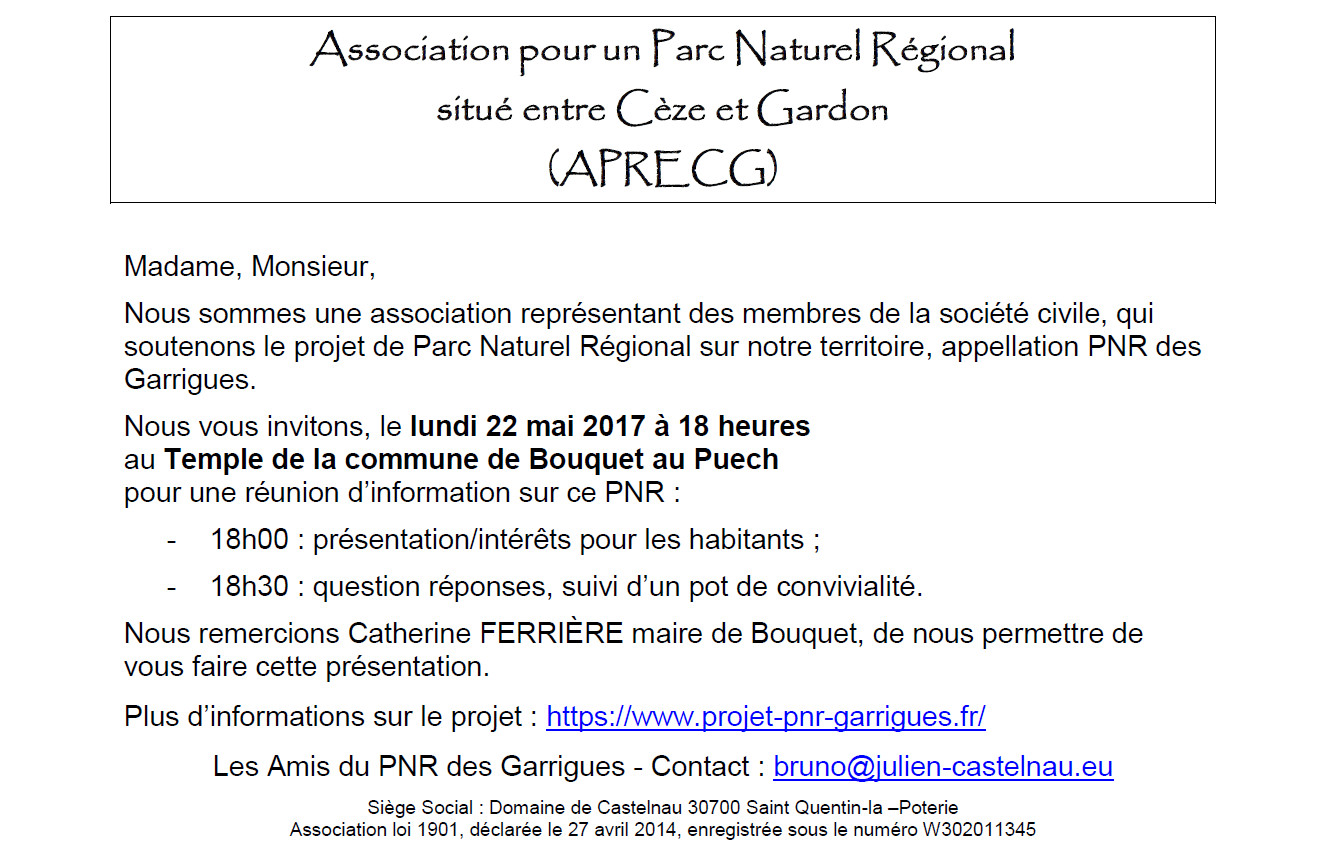 - /Vous voulez comprendre ce qu’un Parc Naturel Régional entre Cèze et Gardon pourrait apporter à notre région : venez écouter l’Association du PNR des Garrigues le lundi 22 mai à 18h au Temple du Puech, à Bouquet !