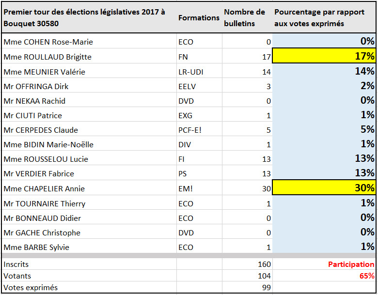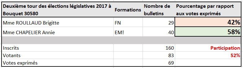 Résultats des législatives les 11 et 18 juin 2017, à Bouquet Résultats du deuxième tour des législatives le 18 juin 2017, à Bouquet Résultats du premier tour des législatives le 11 juin 2017, à Bouquet - 06/2017 Categories: Vie municipale