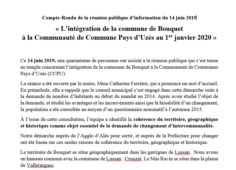 Le compte-rendu in extenso de la réunion publique d’information qui a eu lieu le 14 juin 2019, au sujet de l’intégration de la commune de Bouquet à la Communauté de Communes Pays d’Uzès, prévue le 1er janvier 2020