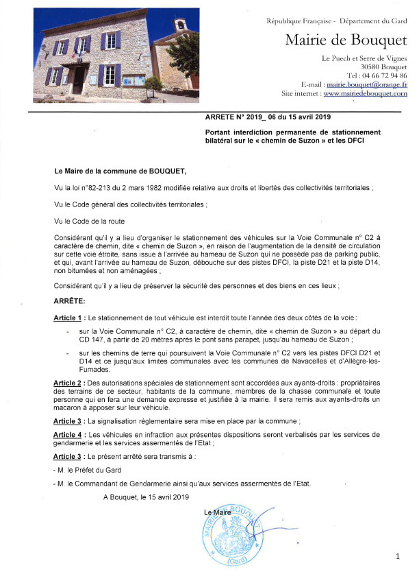 Rappelez-vous que cette interdiction de stationner ne s’adresse pas aux ayants droit que sont les habitants de Bouquet, les propriétaires de terrain sur cette zone, et la chasse communale : toutes ces personnes ont reçu ou peuvent demander à la mairie un macaron à apposer sur leur voiture.