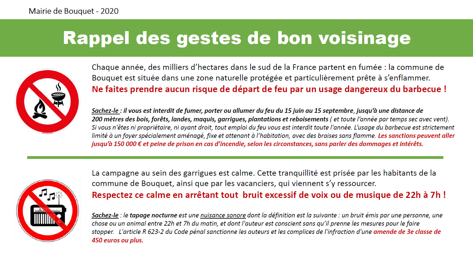 Habitants de Bouquet : ni feu ni bruit cet été, respectons nos voisins !