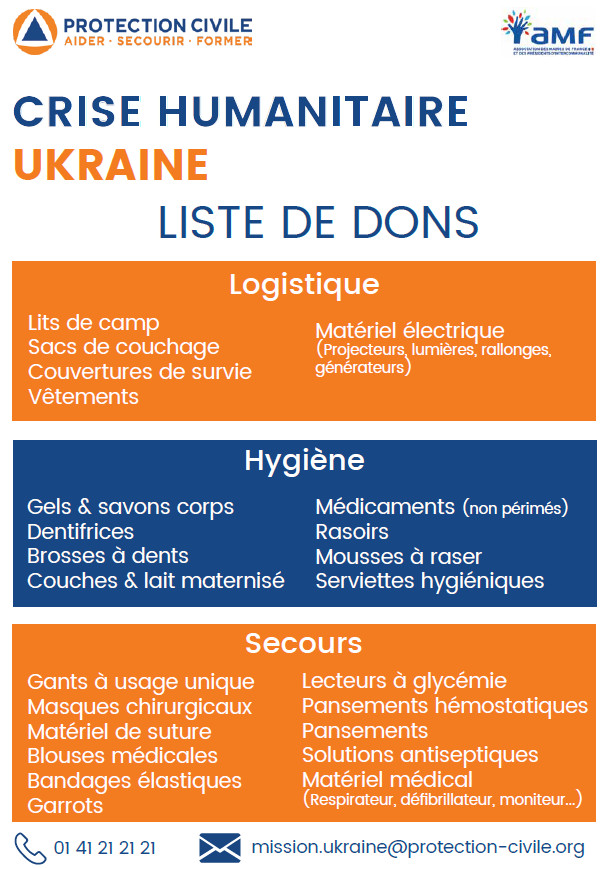 Voici dans le lien ci-dessous le message de la préfecture qui centralise l’offre de logements d’accueil pour les réfugiés Ukrainiens et le message de l’Association des Maires de France pour les dons ou du matériel d’urgence (ci-contre). En savoir plus