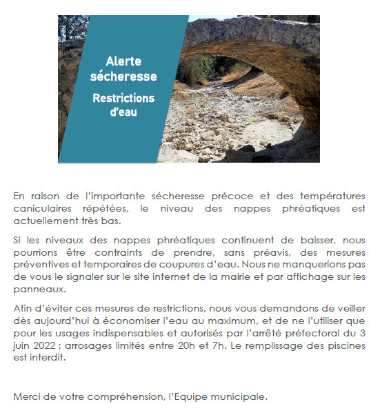 Restrictions d’eau : le bassin amont de la Cèze est en situation d’alerte renforcée : merci de respecter l’interdiction d’arroser entre 8h et 20h, et de remplir les piscines !