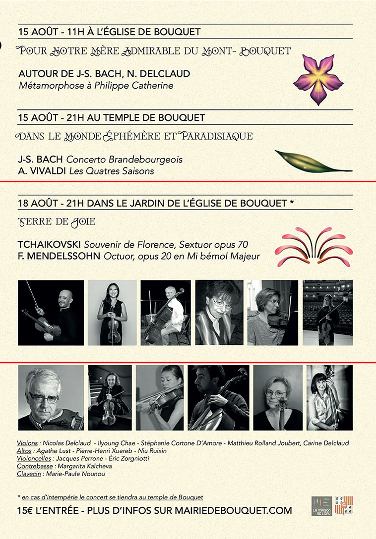 Feedback des deux concerts de ce lundi : « Moment d’allégresse musical au Temple et à l’église de Bouquet à l’écoute des oeuvres de Bach et Vivaldi avec 8 musiciens réunis autour de Nicolas Delclaud par un public aussi enthousiaste que les musiciens ! » En voici quelques illustrations ci-contre.
