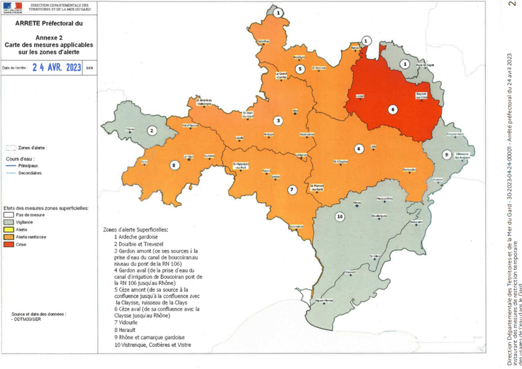 Quinze jours après le classement en alerte sécheresse des bassins de la Cèze et le maintien du reste du département en vigilance, la préfecture annonce un nouveau durcissement dans les restrictions de sécheresse, constatant des assecs sur des cours d’eau secondaires, des niveaux de nappes phréatiques bas pour la saison et des débits de pluie largement en dessous des normales. Au 23 avril, le niveau « crise » a été décrété pour notre région, la plus touchée, et ce jusqu’au 31 octobre 2023.