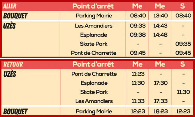 Dès la semaine du 16 octobre 2023, un bus CCPU sera susceptible de vous emmener de Bouquet (parking de la mairie au Puech) à Uzès, et de vous en ramener, 2 fois les mercredi et 1 fois le samedi. Ceci pour 1,5 € le trajet quel qu’il soit. Une seule condition : pour bénéficier de ce service, il vous suffit de réserver votre trajet par téléphone au 0 805 608 100, au plus tard la veille à 16h. Un chauffeur se rend alors au point d’arrêt désigné pour accueillir le demandeur. L’itinéraire du bus est ensuite planifié en fonction des réservations enregistrées par les utilisateurs.