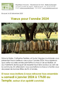 Mme le Maire, Catherine Ferrière, et toute l’équipe municipale vous présentent leurs meilleurs vœux pour l’année 2024. Nous espérons que cette nouvelle année permettra à chacun de se réaliser, et aux habitants de Bouquet de resserrer leurs liens sociaux au sein de la commune. En attendant, nous souhaitons à chacun d’entre vous de passer de bonnes fêtes de fin d’année. Et nous vous invitons à nous retrouver tous ensemble le samedi 6 janvier 2024 à 17h30 au Temple, autour d’un apéritif convivial.
