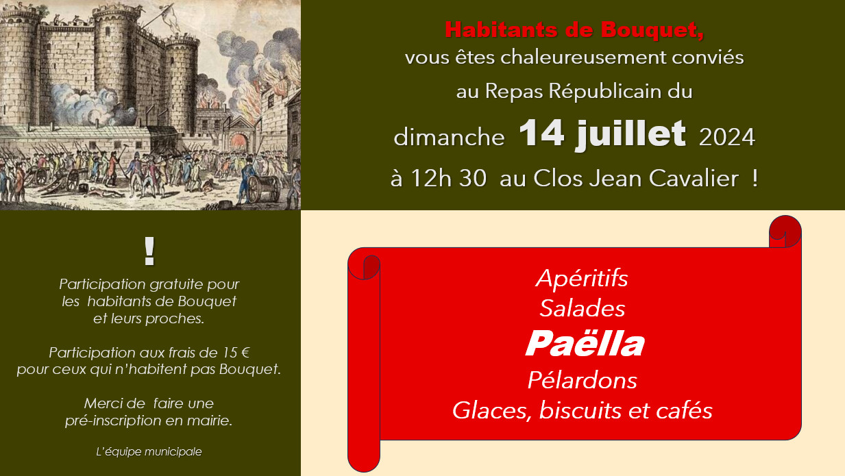 Déjeûner Républicain le dimanche 14 juillet prochain pour les habitants de Bouquet et leurs proches ! C’est au Clos Jean Cavalier, comme d’habitude, à 12h 30. - 07/2024 Categories: Evènements