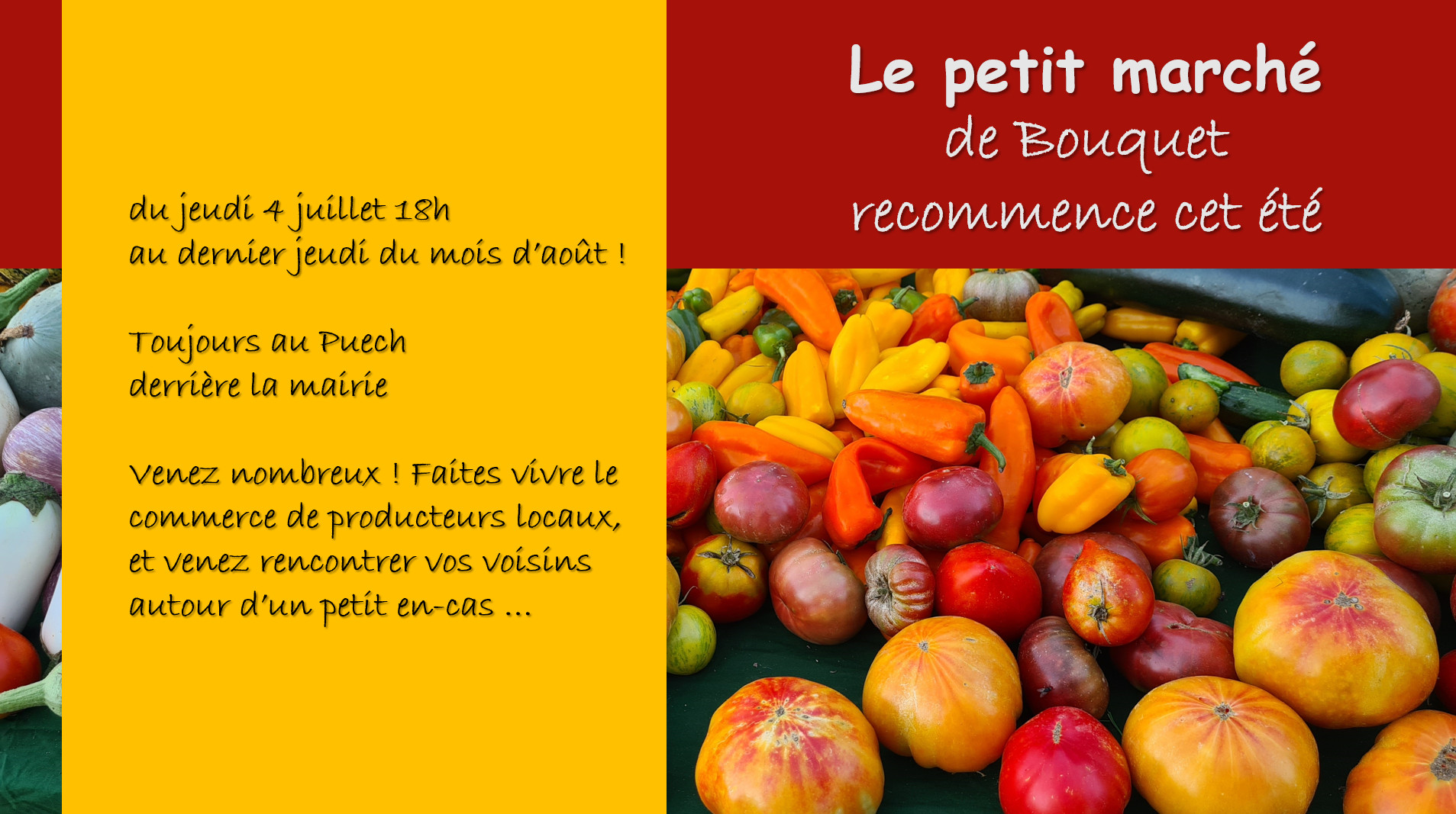 Le Petit Marché de Bouquet reprend cet été Le Petit Marché de Bouquet reprend cet été dès le jeudi 4 juillet 18h, jusqu’au dernier jeudi d’août, au Puech derrière la mairie : venez nombreux ! - 08/2024 Categories: Vie municipale