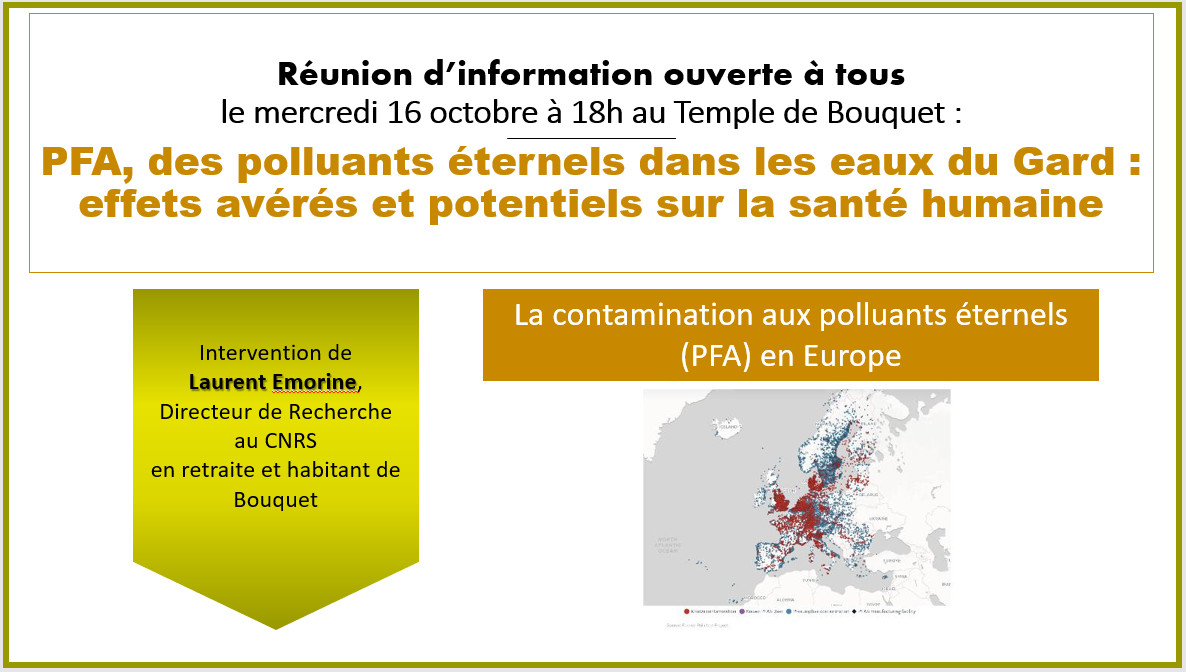 - /Réunion d’information ouverte à tous le mercredi 16 octobre à 18h au Temple de Bouquet – « PFA, des polluants éternels dans les eaux du Gard : effets avérés et potentiels sur la santé humaine »