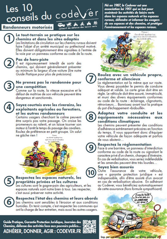 En ce qui concerne les engins homologués, seuls autorisés à circuler sur les voies publiques, – chemins ouverts à la circulation des moteurs compris (**), les bonnes pratiques de cohabitation paisible entre randonneurs motorisés et promeneurs à pied sont rappelées dans ce flyer des «10 conseils du Codever» (Cf ci-contre) (En savoir plus).