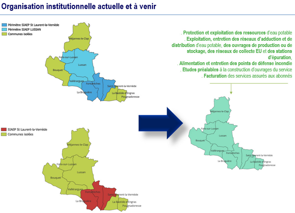 La question était bien : au profit de qui ? Normalement c’est la CCPU d’Uzès qui aurait du en reprendre la responsabilité à cette date. Sauf si plusieurs communes se regroupaient en ce que l’on appelle un « syndicat eau et assainissement inter-communautaire » qui couvre plusieurs intercommunalités, – et que le Préfet donnait sa validation. C’est ainsi que cet été 2024, les 3 communes du Syndicat des eaux de Lussan (Lussan, Fons-sur-Lussan et Vallérargue), les 3 communes du Syndicat des eaux et de l’assainissement de Saint-Laurent-la-Vernède (Saint-Laurent la Vernède, Fontarèches et La Bruguière), plus 4 communes isolées (Bouquet, La Bastide d’Engras et Pougnadoresse, mais surtout Méjannes le Clap qui ne fait pas partie de la CCPU) se sont regroupées pour voter leur demande collective d’adhésion au SIAEPA de Saint-Laurent la Vernède, après extension du périmètre de celui-ci.