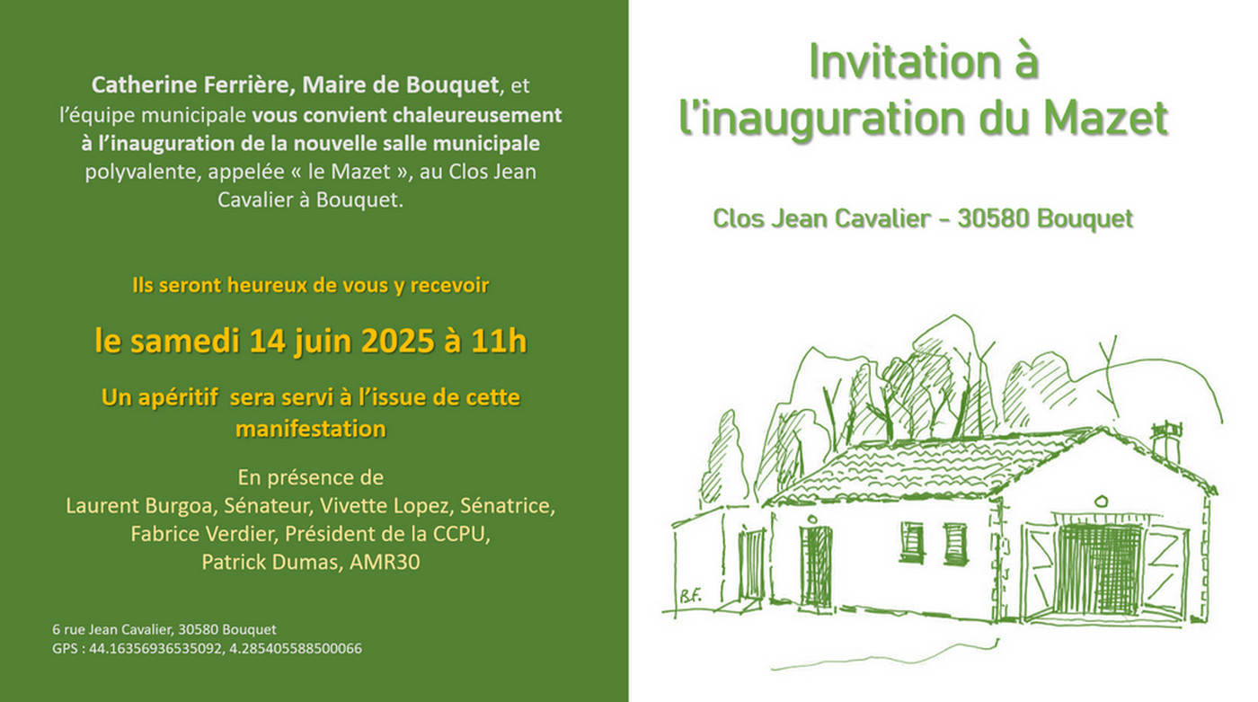 Le Mazet du Clos Jean Cavalier, salle polyvalente, a été inauguré Le Mazet du Clos Jean Cavalier, salle polyvalente, est maintenant disponible à la réservation ! En savoir plus Tous les habitants de Bouquet invités à l’inauguration du Mazet, au Clos Jean Cavalier, le samedi 14 juin à 11h ! - 06/2025 Categories: Patrimoine