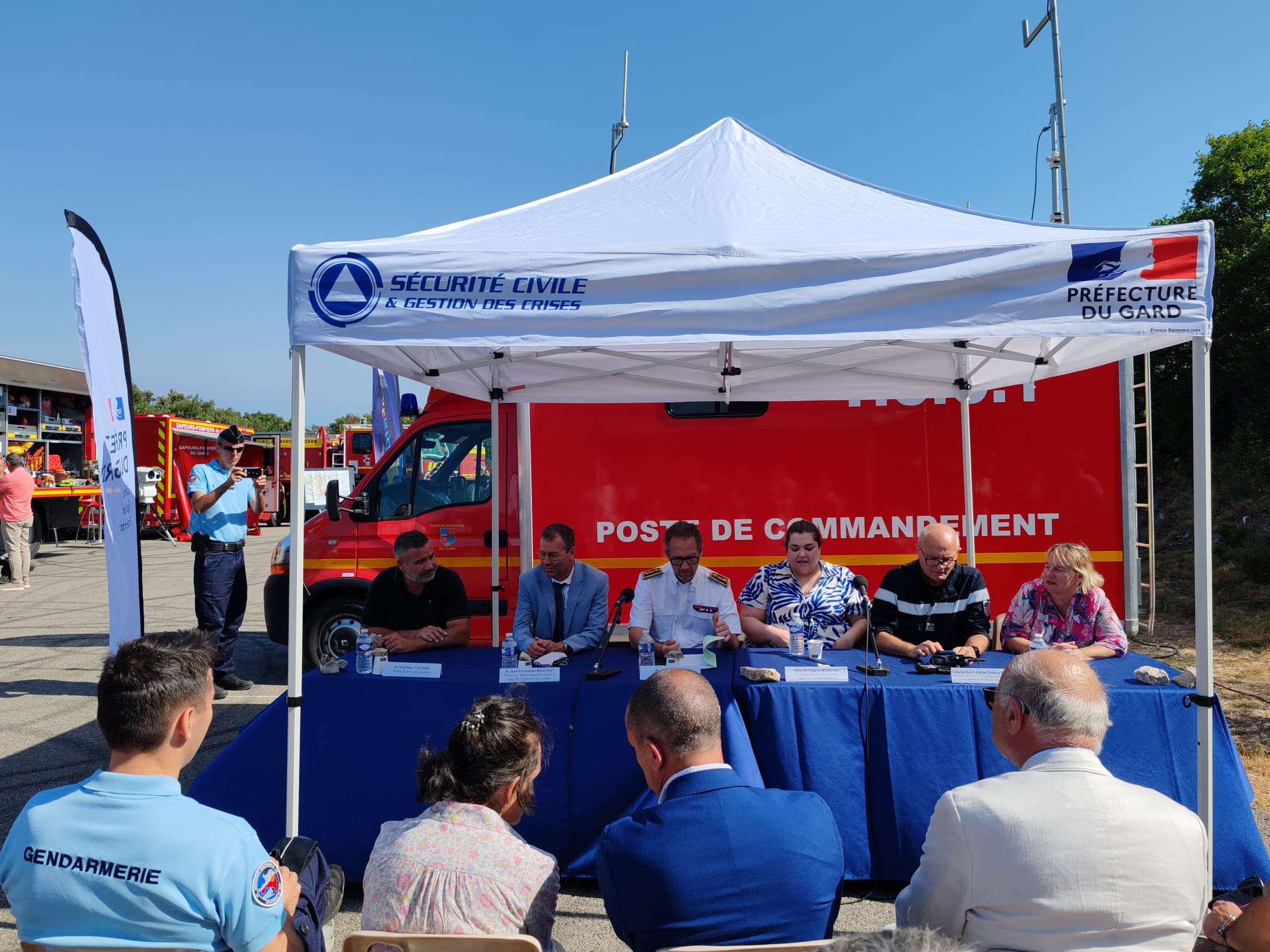 Jeudi 3 juillet à 9h, Catherine Ferrière, Maire et Thierry Lattard, Adjoint, étaient présents au lancement de la campagne de surveillance estivale des feux de forêt au sommet du Mont Bouquet. Le préfet du Gard Jérôme Bonet, la présidence du Conseil départemental représentée par Bérangère Noguier et le Président du SDIS, Alexandre Pissas, nous avaient convié à cette présentation des services engagés pour lutter contre les incendies de forêt : pompiers, gendarmerie, ONF, OFB etc… En plus de la présence humaine des professionnels, une avancée technique majeure pour notre secteur : deux caméras de surveillance ont été installées sur le site pour surveiller le massif forestier sur 360 ° jour et nuit et repérer tout départ de feu. Tous les professionnels, l’Etat, et les élus rappellent que l’essentiel est dans la prévention des incendies. Nous en sommes convaincus. Les moyens d’intervention devant servir à réduire la propagation des feux. La canicule ayant démarré en juin, les risques sont majorés. Soyons tous prudents et vigilants !