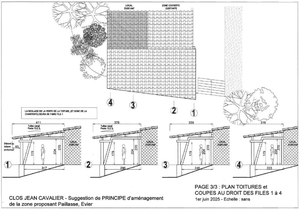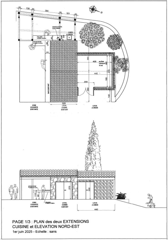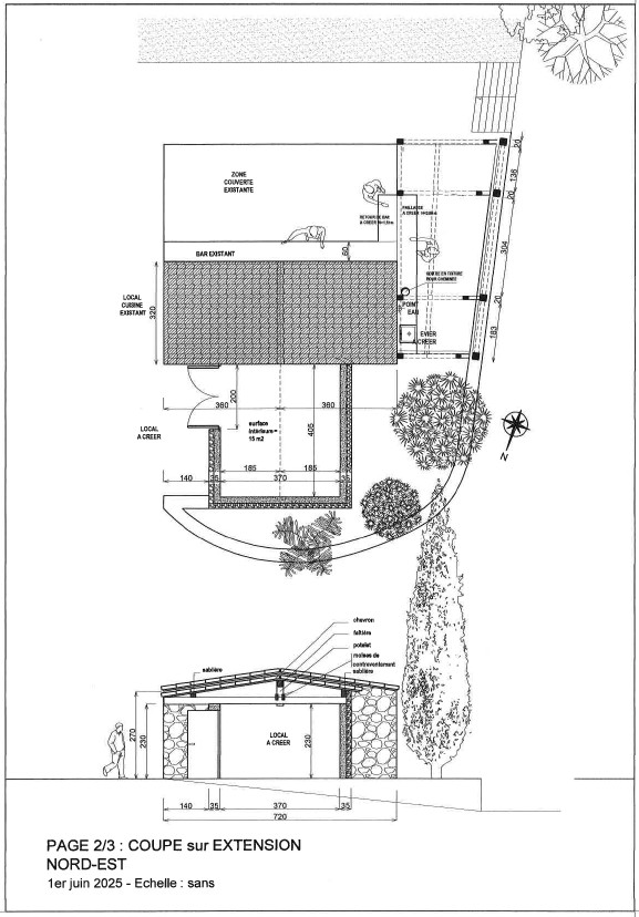 Cet automne vont donc être construites deux petites extensions autour et adossées à la cuisine du Clos Jean Cavalier : un petit local technique derrière la cuisine, qui servira à stocker tables, chaises, etc., au plus près de là où on en a besoin. Pour éviter autant que faire se peut les transvasements d’équipements lourds. Ainsi qu’un grand auvent à gauche du bar, qui pourra servir occasionnellement de cuisine extérieure, derrière un prolongement du bar en L.