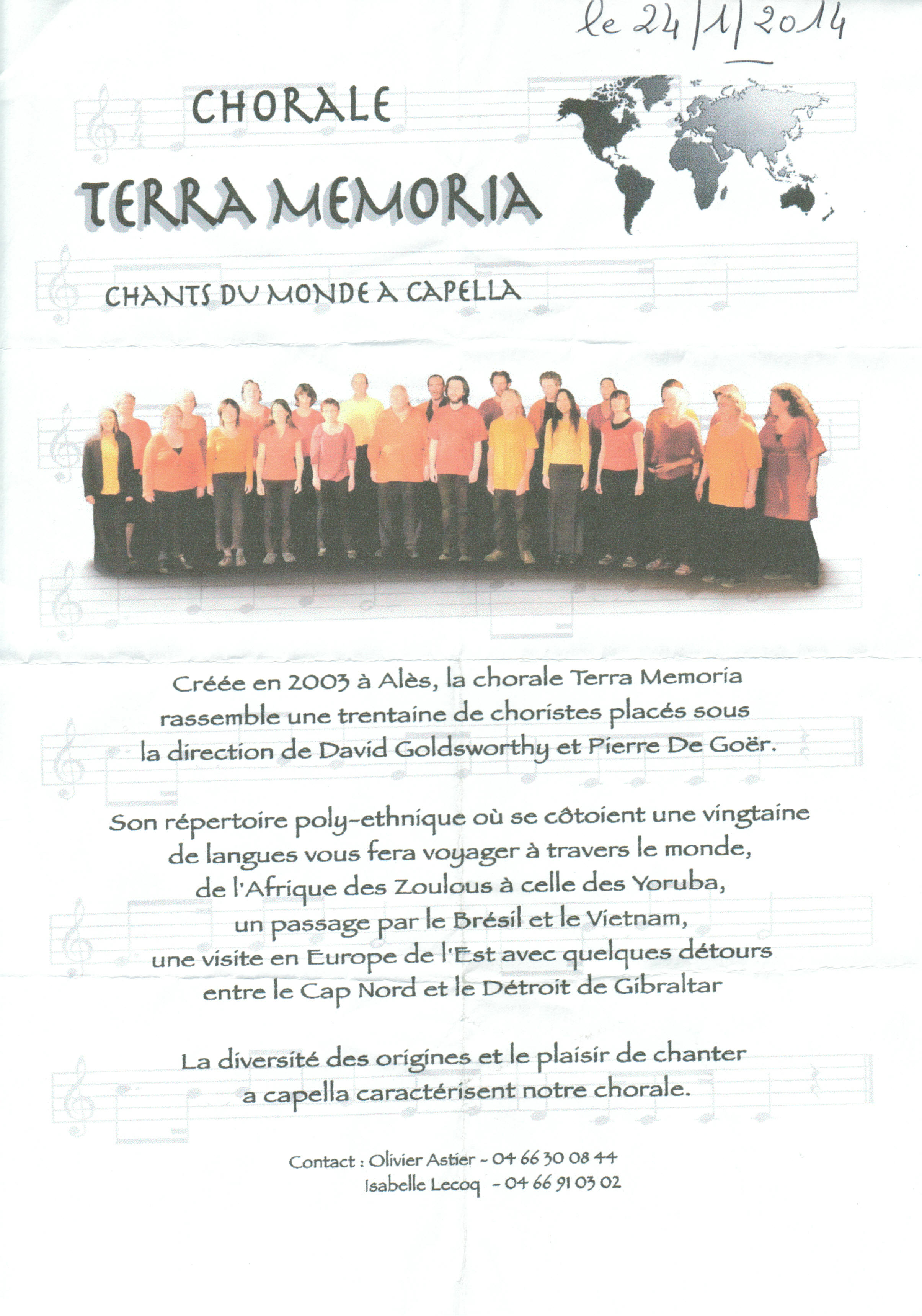 Chorale Terra Memoria, samedi 24 janvier au soir au Temple