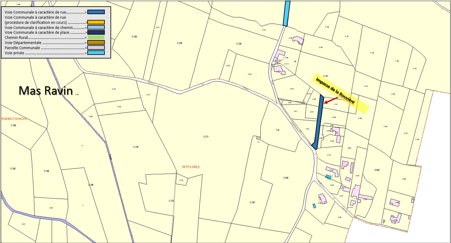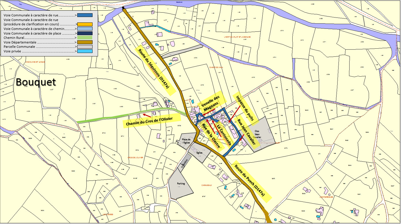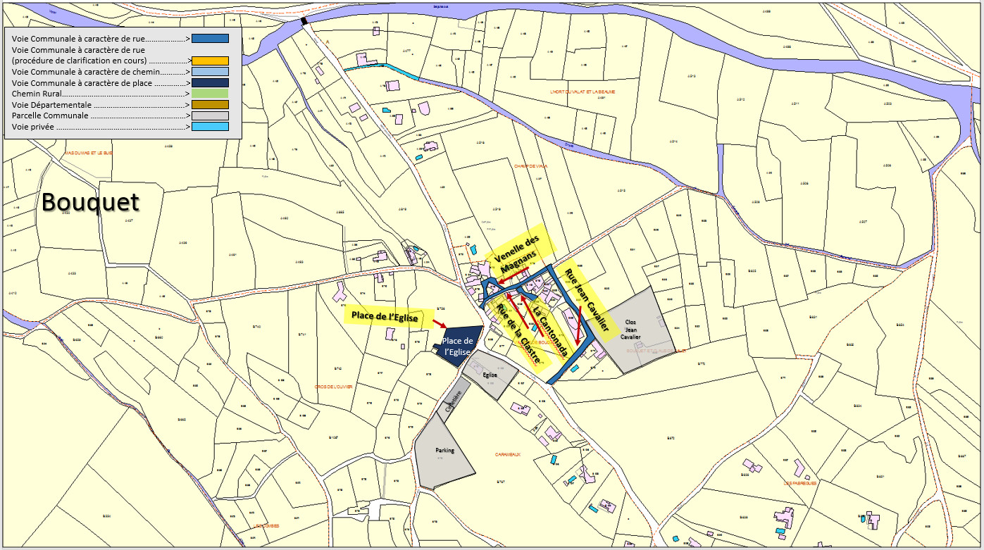 Noms des rues, des routes et des chemins principaux de Bouquet, intégrés par le Cadastre – 2019
