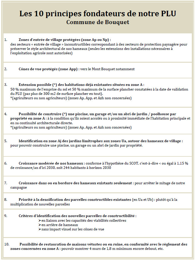 Synthèse des actions de concertation et d’information des habitants de Bouquet au sujet du PLU, du Schéma Directeur de l’Eau et du Schéma Directeur de l’Assainissement